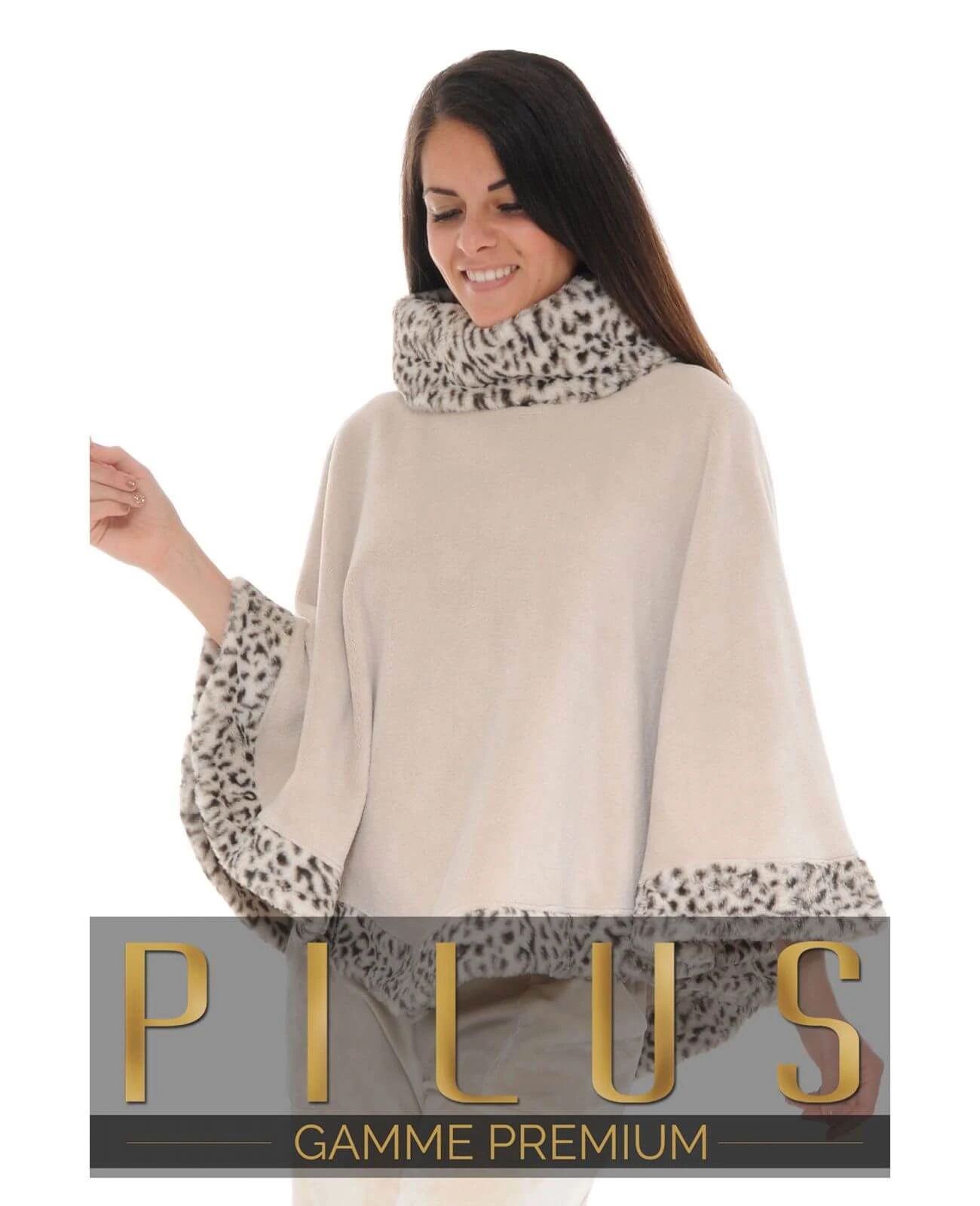 Un imprimé discret et indémodable léopard borde le bas de la cape, et couvre le sublime col montant afin de créer un contraste avec la couleur beige du corps du modèle qui s’associe parfaitement avec le motif animal.