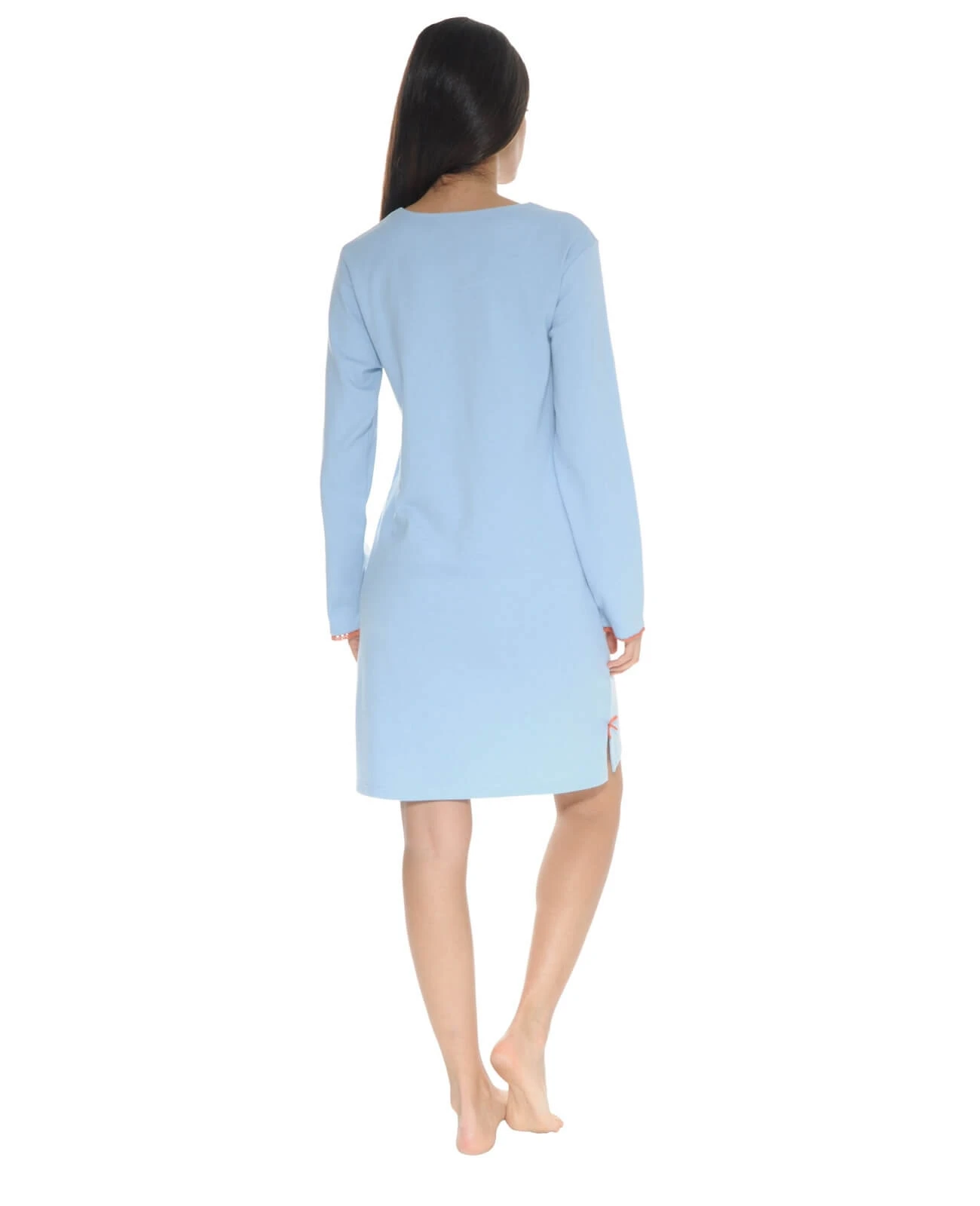 Un bleu tendre pour une chemise de nuit manches longues en jersey de coton épais, une matière souple et chaude très appréciée l hiver. Entre sobriété et finesse, cette robe de nuit col rond avec patte de boutonnage 3 boutons et poche poitrine à fines rayures sera rendre vos nuits plus douces. La longueur de 90 centimètres convient à toutes les tailles et les petits détails tels que le joli croquet aux manches et sur la poche ou les fentes de côté apportent au vêtement style et aisance. Composition : 60% Coton 40% Polyester La mannequin mesure 1m70 et porte une taille S – Livraison rapide en 48 hrs et toujours les retours gratuits (France métropolitaine)