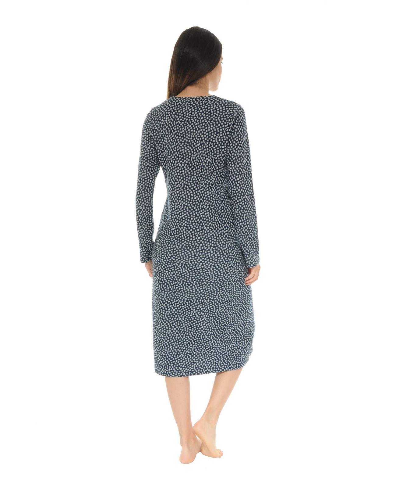 Liquette à encolure arrondie, manches longues, et imprimé de petits carrés gris sur fond bleu marine style graphique qui renvoie un peu de modernité.