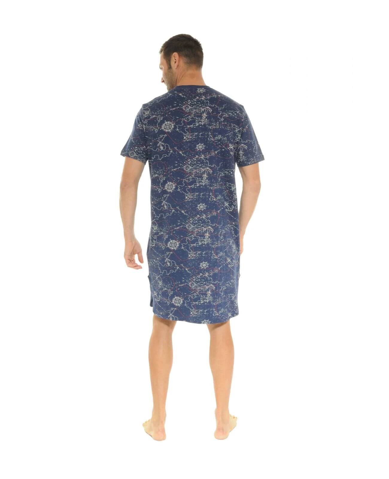 Cette liquette à manches courtes est entièrement imprimé d’un motif marin sur fond bleu marine et est dotée d’un col V ainsi que d’une poche poitrine plaquée sur l’avant ton sur ton avec un biais rouge sur le haut de la poche.