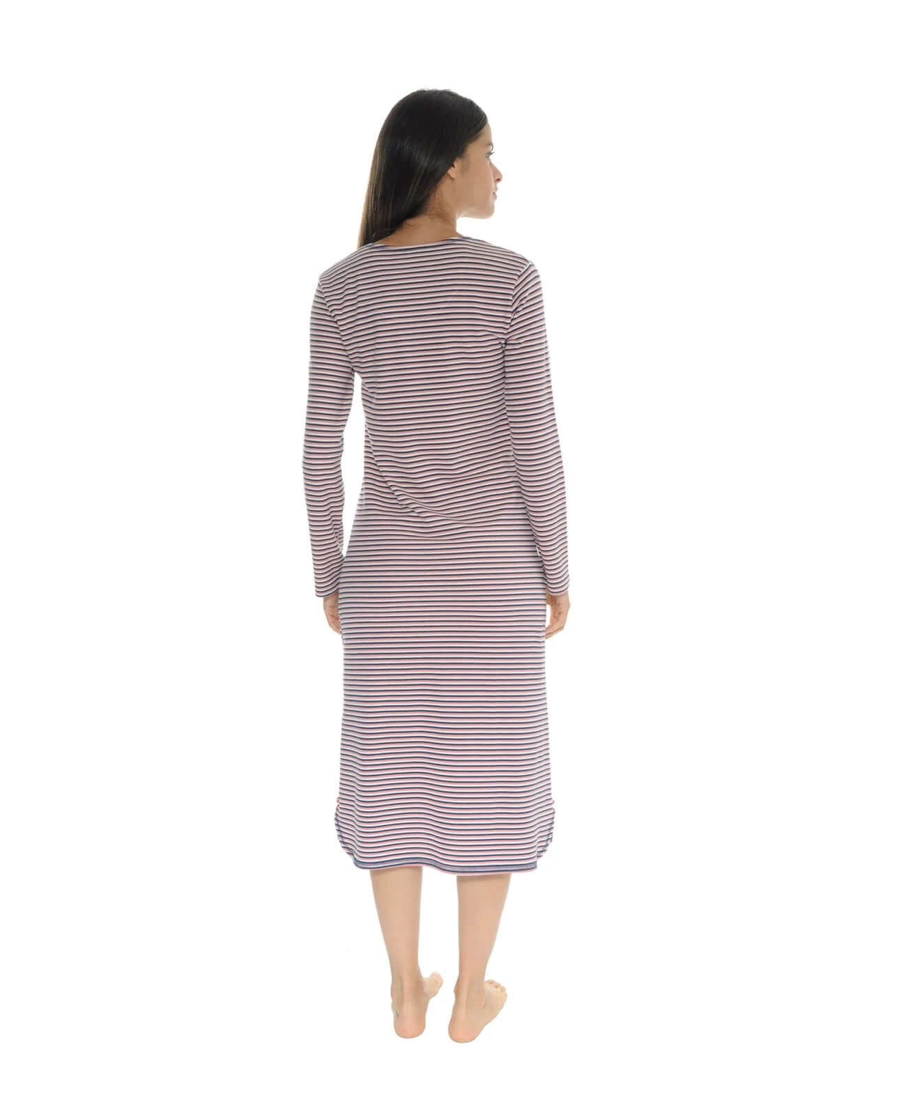 Chemise de nuit lumineuse rayée marine rose et blanc en maille jersey, un ton joyeux et frais. Robe d hôtesse longue de 115cm à rayures, poche poitrine unie rose réhaussée d un galon en velours marine. La coupe est droite, le style est sobre et comme toujours, on soigne les détails : le col rond agrémenté d un bouton et d un petit noeud, le bas de la robe arrondi avec sa surpiqûre marine , ses deux boutons roses de chaque côté , le rappel du tissu rayé mais on aime aussi le tombé souple de la matière, un mélange 95% coton 5% élasthanne . Cette robe est disponible de la Taille 36 à 54. La mannequin mesure 1m70 et porte une taille S – Livraison rapide en 48 hrs et toujours les retours gratuits (France métropolitaine)