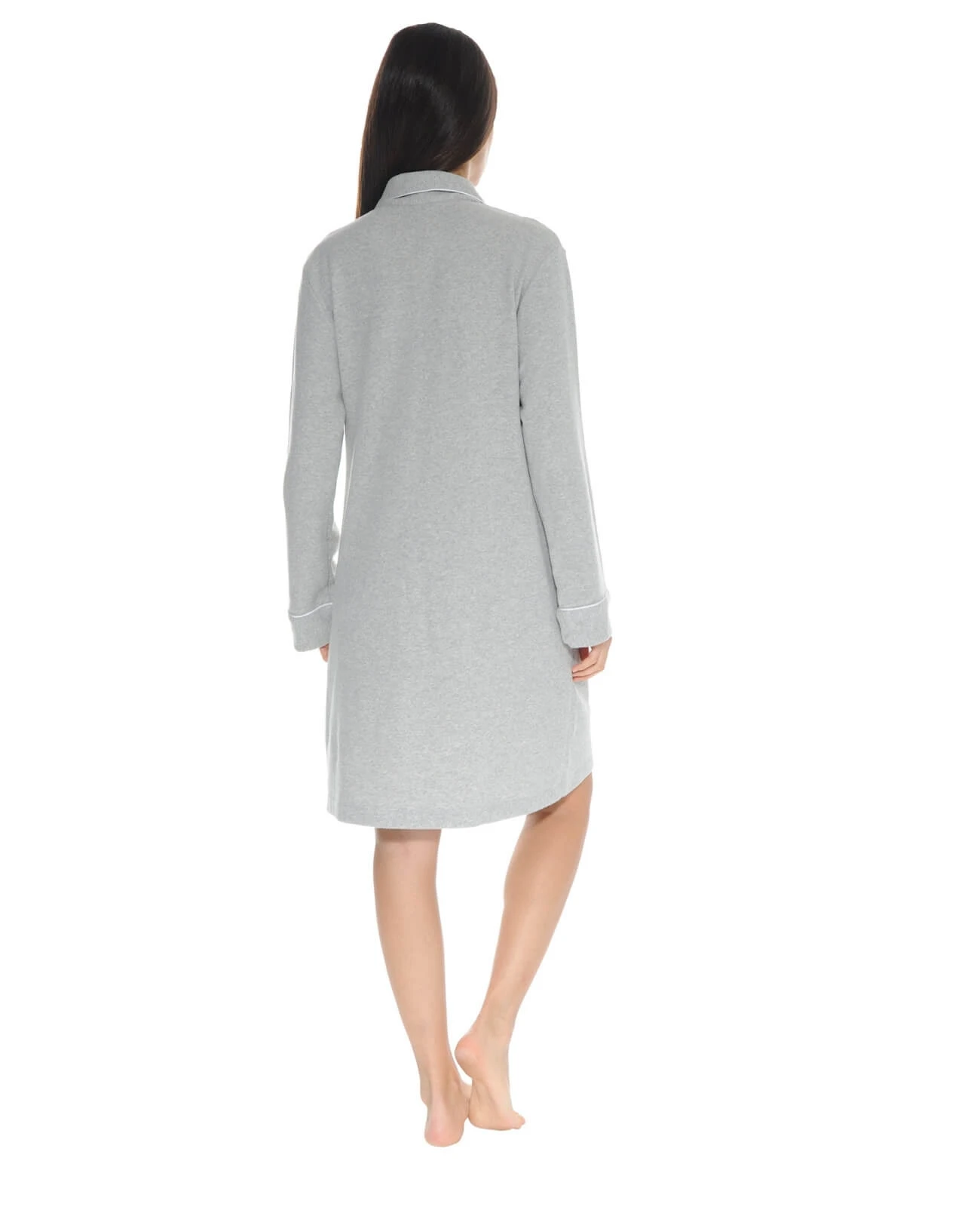 La marque PILUS est présente depuis plus de vingt ans sur les cinq continents dans les plus belles boutiques. Les belles matières, les finitions raffinées et les coupes impeccables, caractérisent cette gamme Premium. ! Liquette manches longues, col chemisier, entièrement boutonnée. Une forme classique chic en jersey molleton, une matière douce et chaude pour tous vos moments cocooning. Des finitions soignées, un passepoil contrasté souligne le col, la bande de boutonnage, la poche poitrine et le revers des manches. Une belle matière déclinée dans un ton de gris perle pour un style épuré et sublimé par des boutons en nacre gravés de la marque PILUS. KATE une chemise de nuit très élégante de 90cm. Jersey molleton : 62%coton 38%polyester