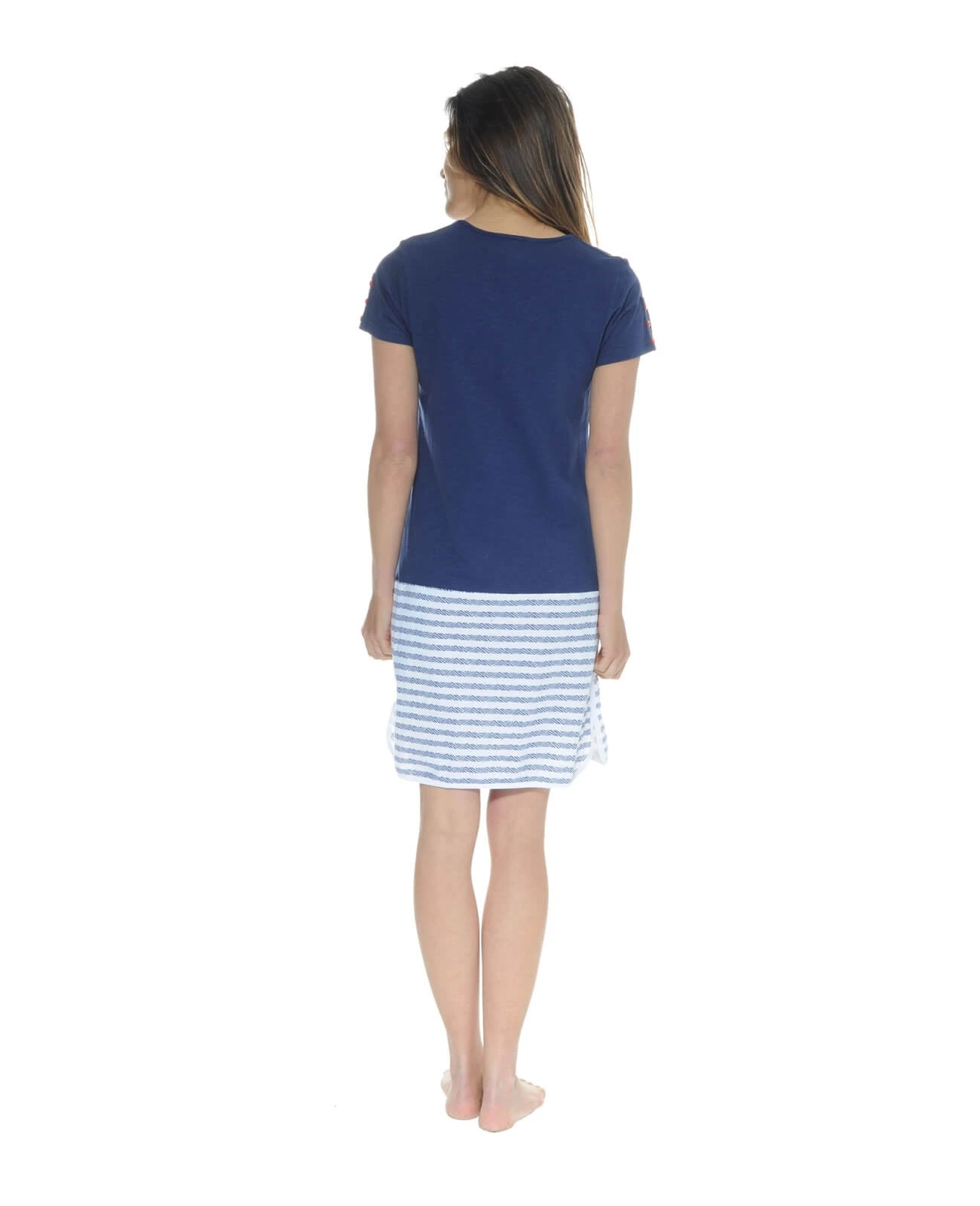 Féminine et décontractée , robe maille esprit marin indispensable de votre dressing estival. Un thème chic et élégant, robe manches courtes 100% coton, col rond terminé par une fente et 3 boutons rouges fantaisies. Le haut de la robe est uni marine tandis que la jupe au bas arrondi est rayée marine. Une irrésistible robe balnéaire aux délicates finitions comme les 3 boutons rouges fantaisies sur les manches ou sa poche poitrine ton sur ton agrémentée d une surpiqûre rouge. Longueur 90cm La mannequin mesure 1m70 et porte une taille S – Livraison rapide en 48 hrs et toujours les retours gratuits (France métropolitaine)
