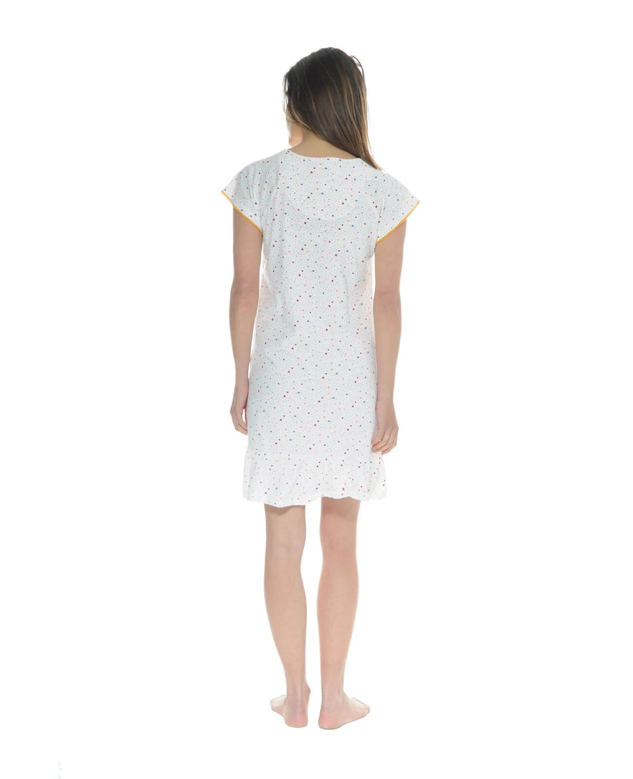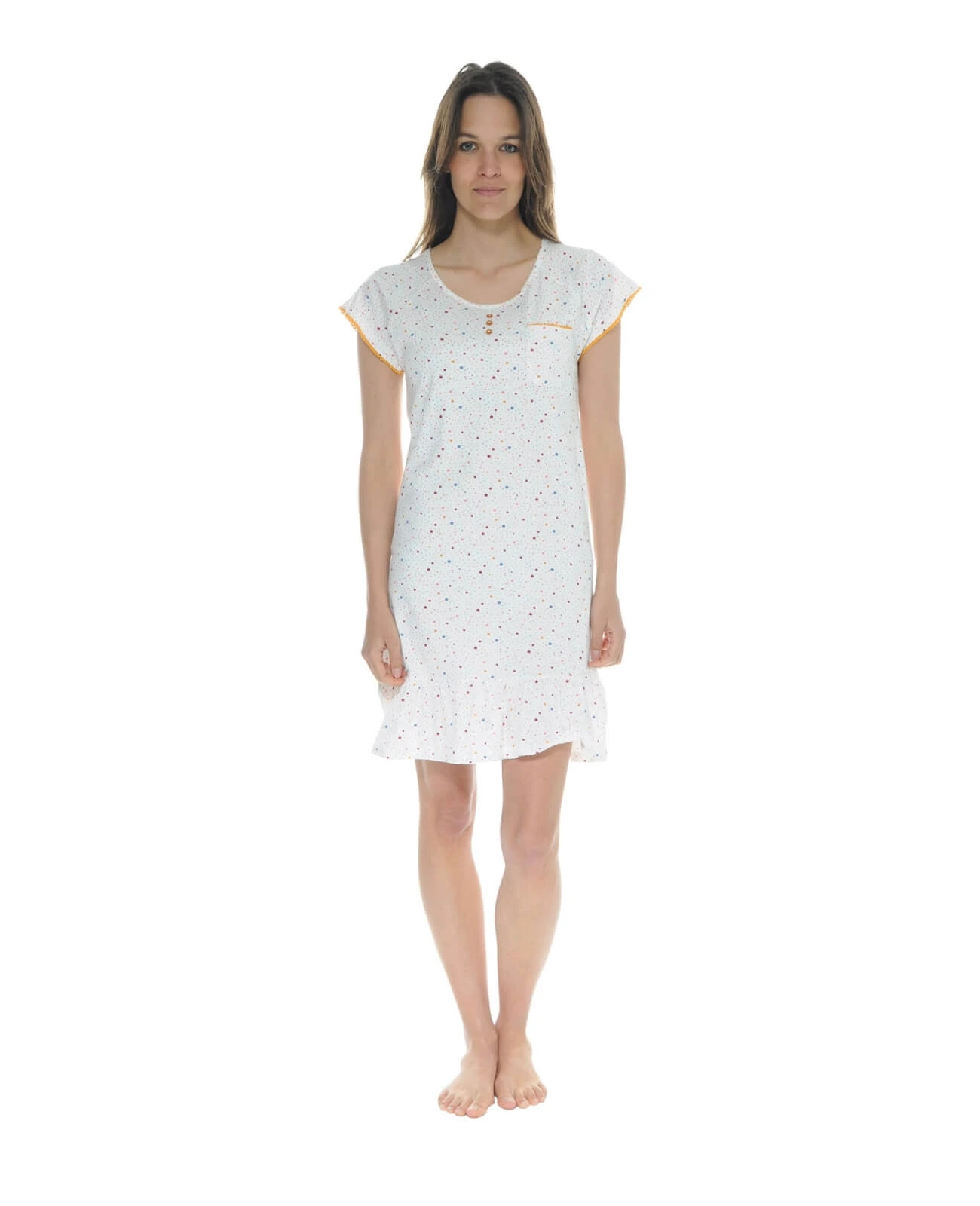 Craquez pour cette robe de nuit manches courtes à lesprit romantique. Un jersey de pur coton doux et délicat, une palette de pois déclinés dans les tons de orange-bleu-bordeaux sur fond écru sublimée par de délicates finitions comme le croquet orangé, fin et raffiné aux manches et sur le haut de la poche poitrine. Sa coupe droite avec son volant rajouté au bas de la robe procure une grande liberté de mouvements, idéale pour vos soirées estivales. La mannequin mesure 1m70 et porte une taille S – Livraison rapide en 48 hrs et toujours les retours gratuits (France métropolitaine)