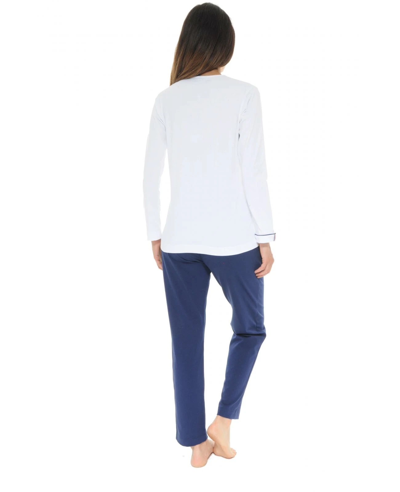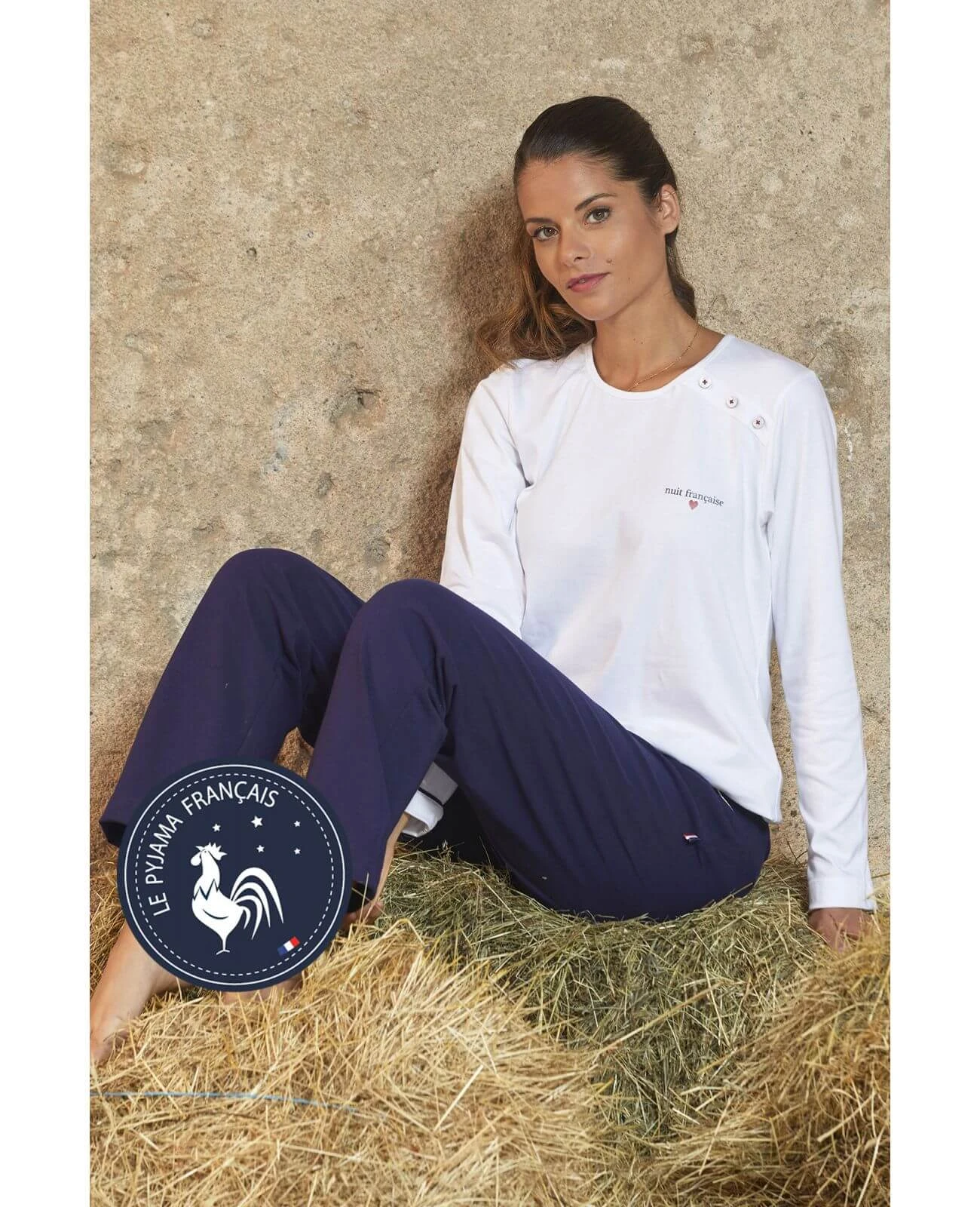 Une fabrication française aux délicates finitions. Haut maille jersey, col rond bordé et patte épaule avec 3 boutons blancs.