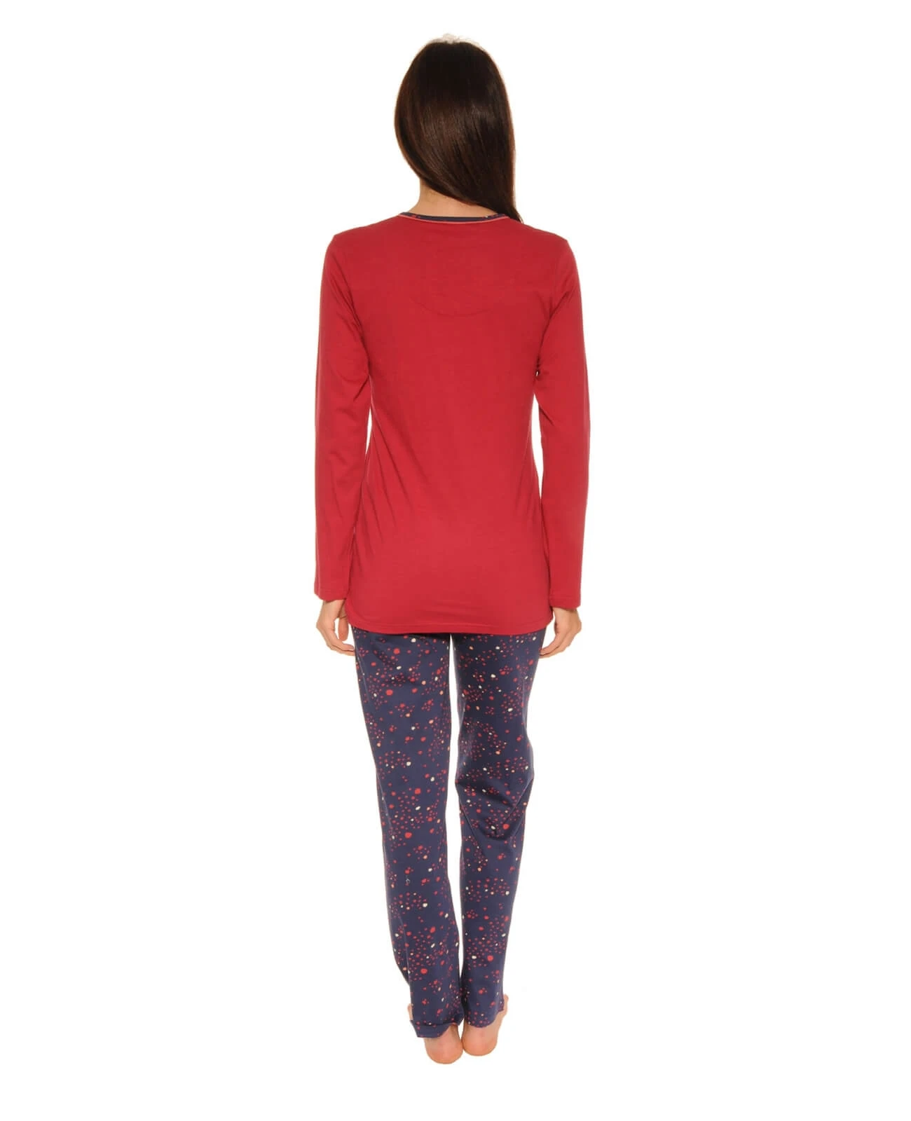 Pyjama chic et lumineux dans les tons de rouge mixé à un imprimé marine à pois. On craque pour les détails et finitions de ce modèle. Tee shirt en maille jersey 100% coton uni rouge, col rond ouverture par 4 boutons rouges et blancs sur patte de boutonnage marine parsemée de pois, poche poitrine en opposition marine à pois. Pantalon droit en maille jersey décliné dans un imprimé de pluie de pois sur fond marine, ceinture élastiquée. Un pyjama élégant pour tous vos moments de détente. La mannequin mesure 1m70 et porte une taille S – Livraison rapide en 48 hrs et toujours les retours gratuits (France métropolitaine)