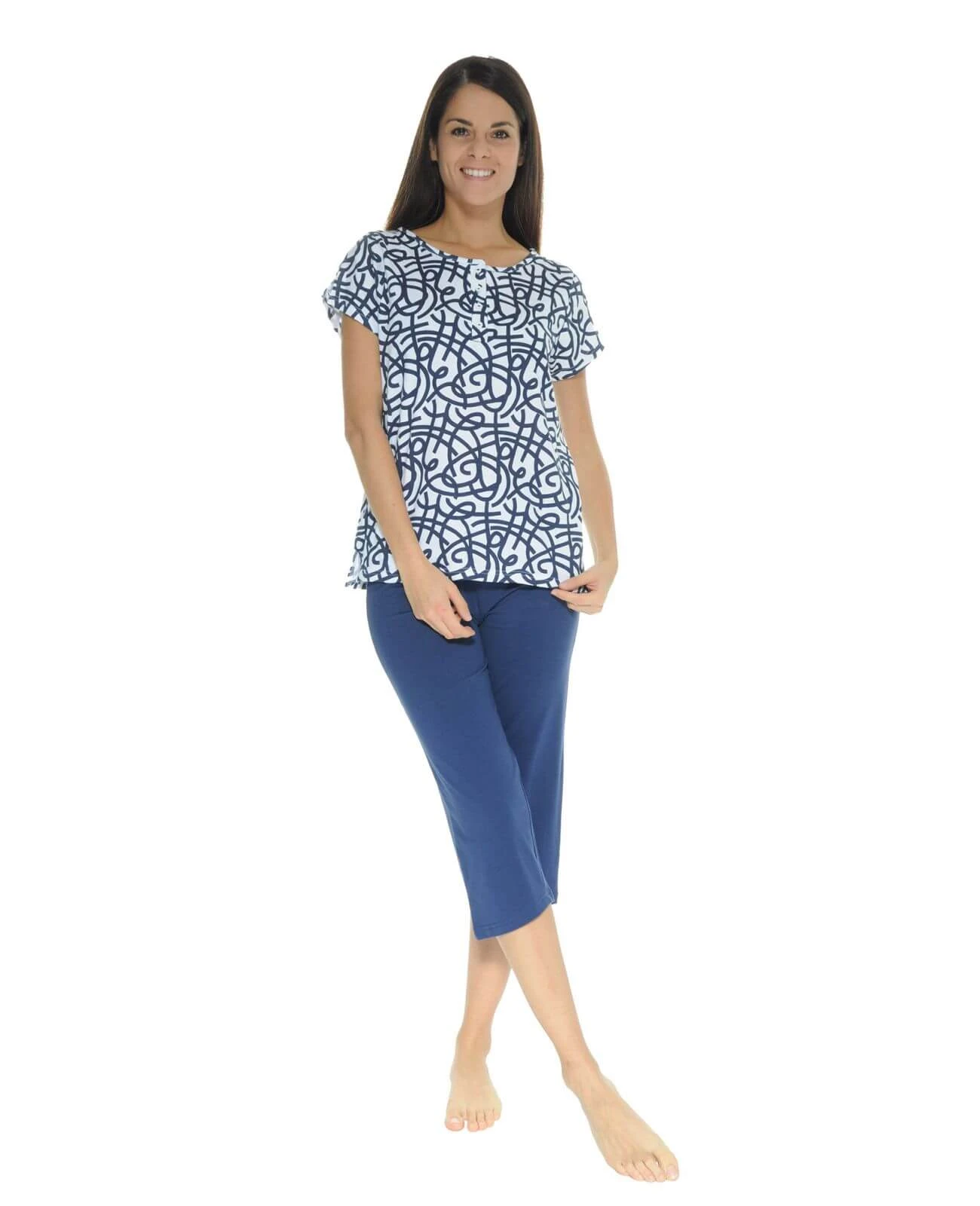 Un haut très stylé à l’imprimé arabesques dans un coloris marine et blanc profond, élégant et intemporel.