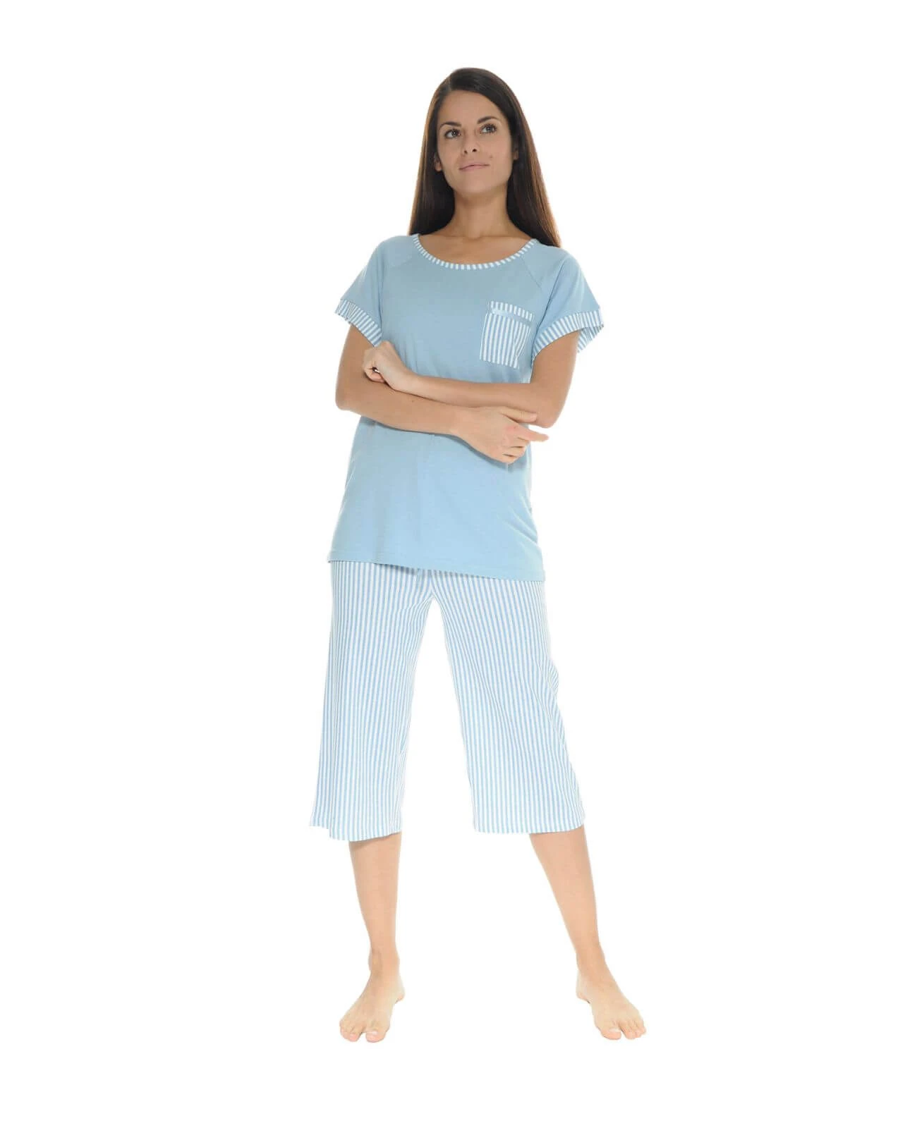 Tee shirt bleu ciel uni, très chic avec ses finitions dans le tissu rayé du pantacourt.