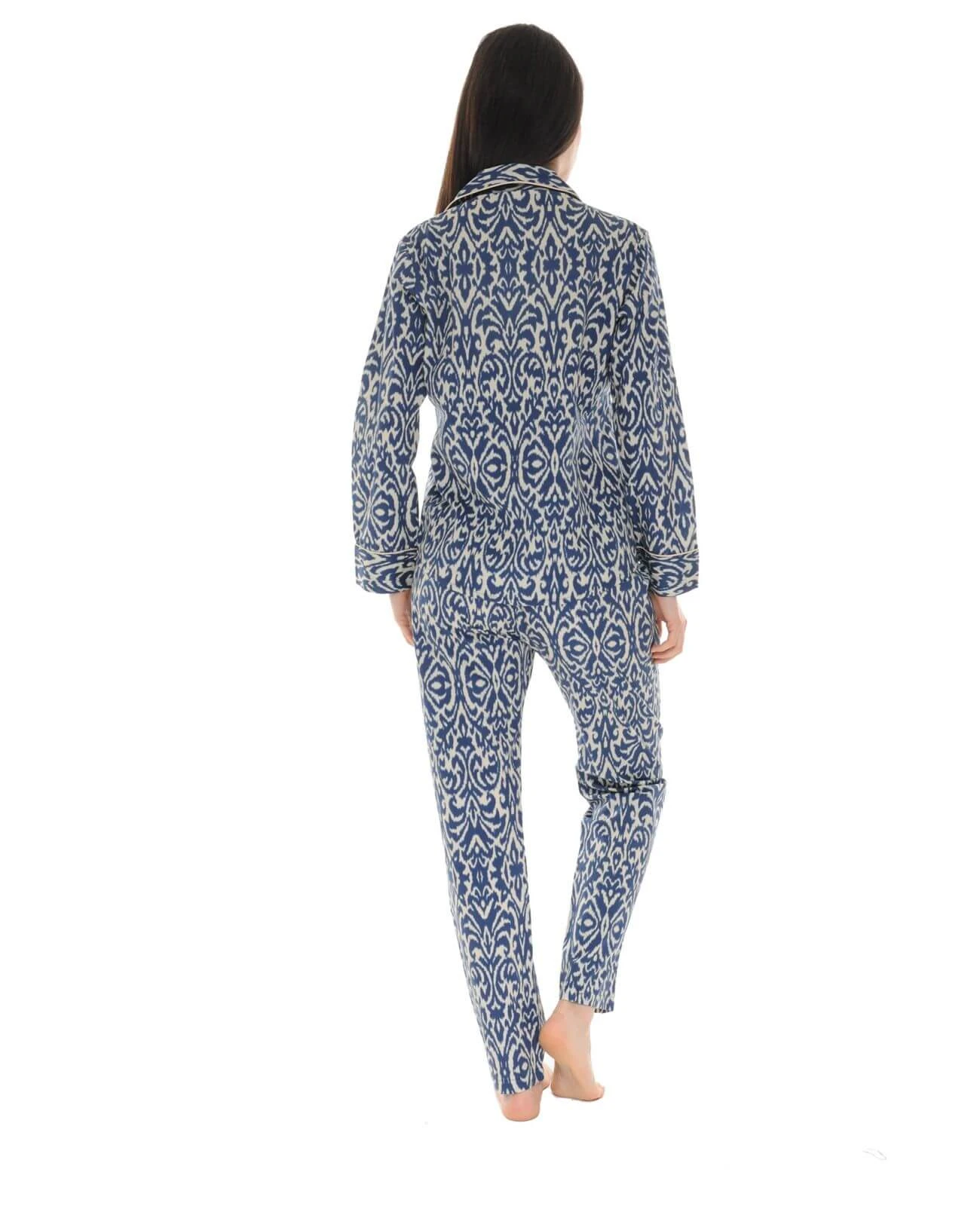 La chemise au col tailleur est entièrement boutonnĂ©e de 5 boutons dont un bouton sous col. L’ensemble est imprimĂ© d’un motif bleu marine sur fond blanc. Les manches et le col sont bordĂ©s d’un liserĂ© discret beige.