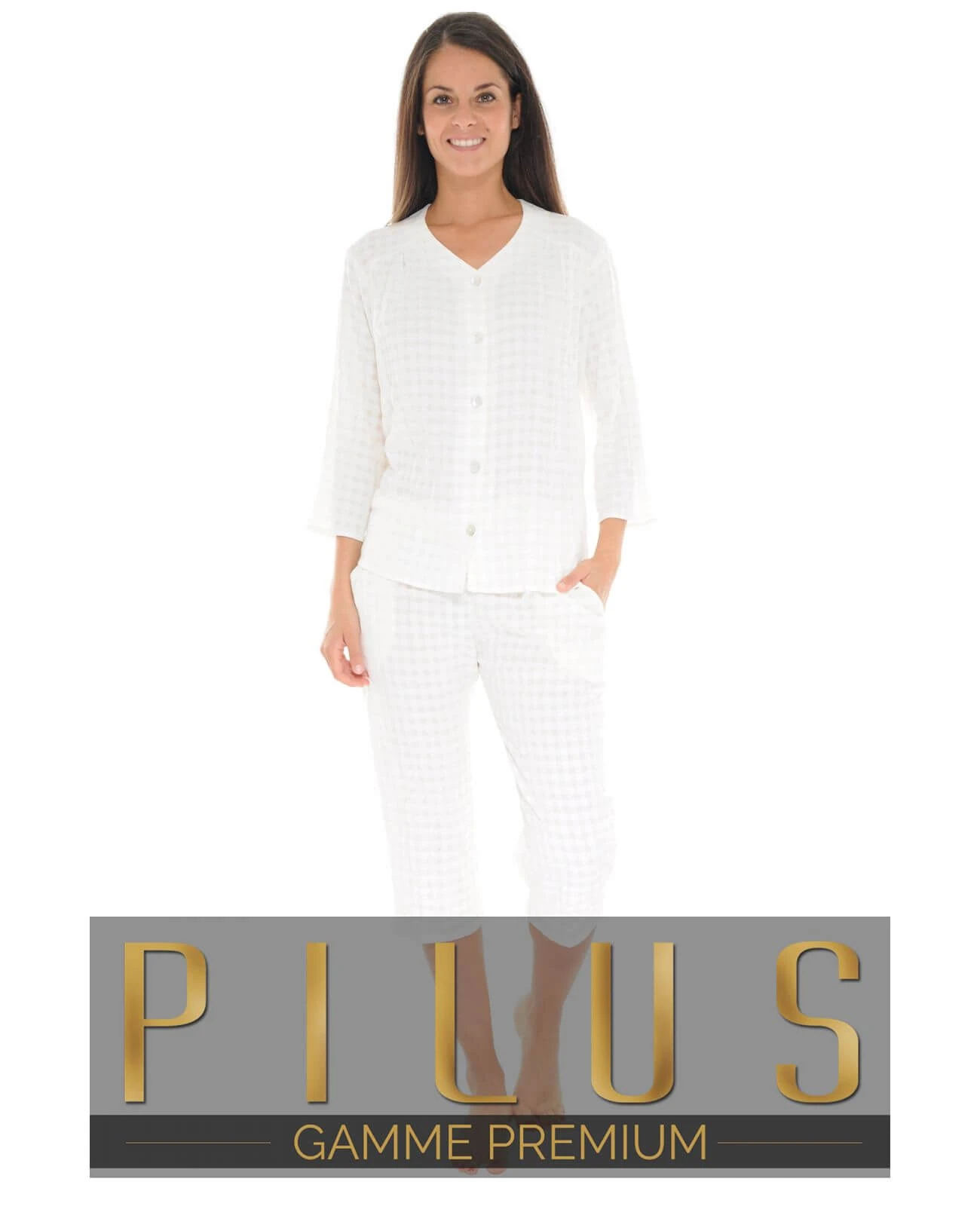 Découvrez le confort de la popeline avec le pyjama YACINTHE et son imprimé discret et raffiné à carreaux aux tons écru.