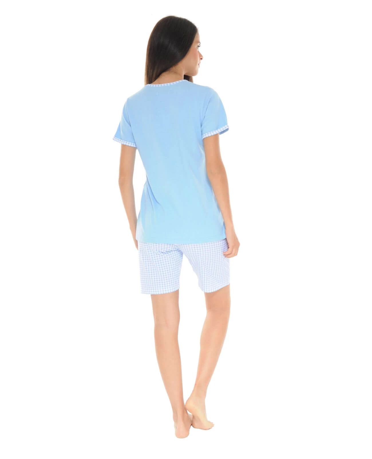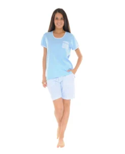 Ce pyjama est composĂ© d’un t-shirt uni bleu ciel Ă manches courtes avec un classique col rond ainsi que d’une poche poitrine portant le motif Ă carreaux qui se retrouve aussi sur le bas des manches en guise de rappel.