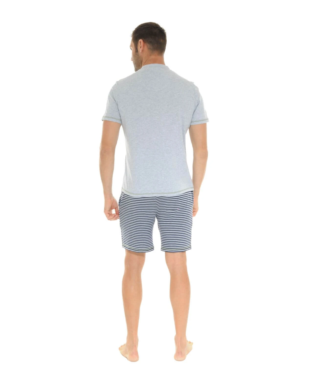 Le t-shirt à manches courtes gris uni possède un col V ainsi qu’une poche poitrine imprimée rayée en harmonie avec l’imprimé du short.