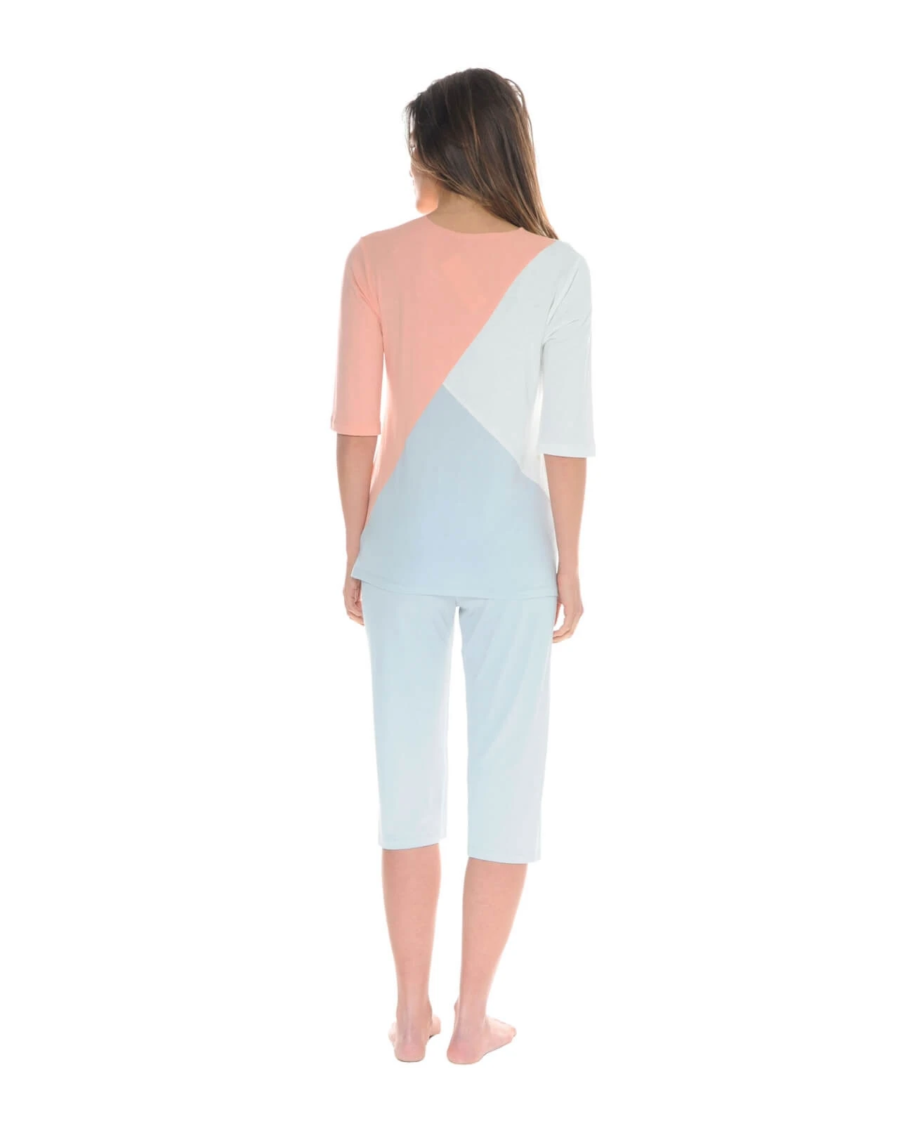 Une collection printemps aux couleurs naturelles. Haut en maille viscose, fluide et doux, encolure ronde, manches aux coudes, une découpe asymétrique originale et moderne dans les tons de ivoire , saumon et ciel. Le bas, un corsaire de 75cm décliné dans la même matière pour un confort optimal, taille élastiquée. La mannequin mesure 1m70 et porte une taille S – Livraison rapide en 48 hrs et toujours les retours gratuits (France métropolitaine)