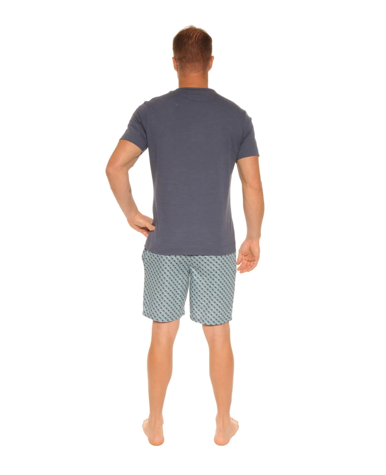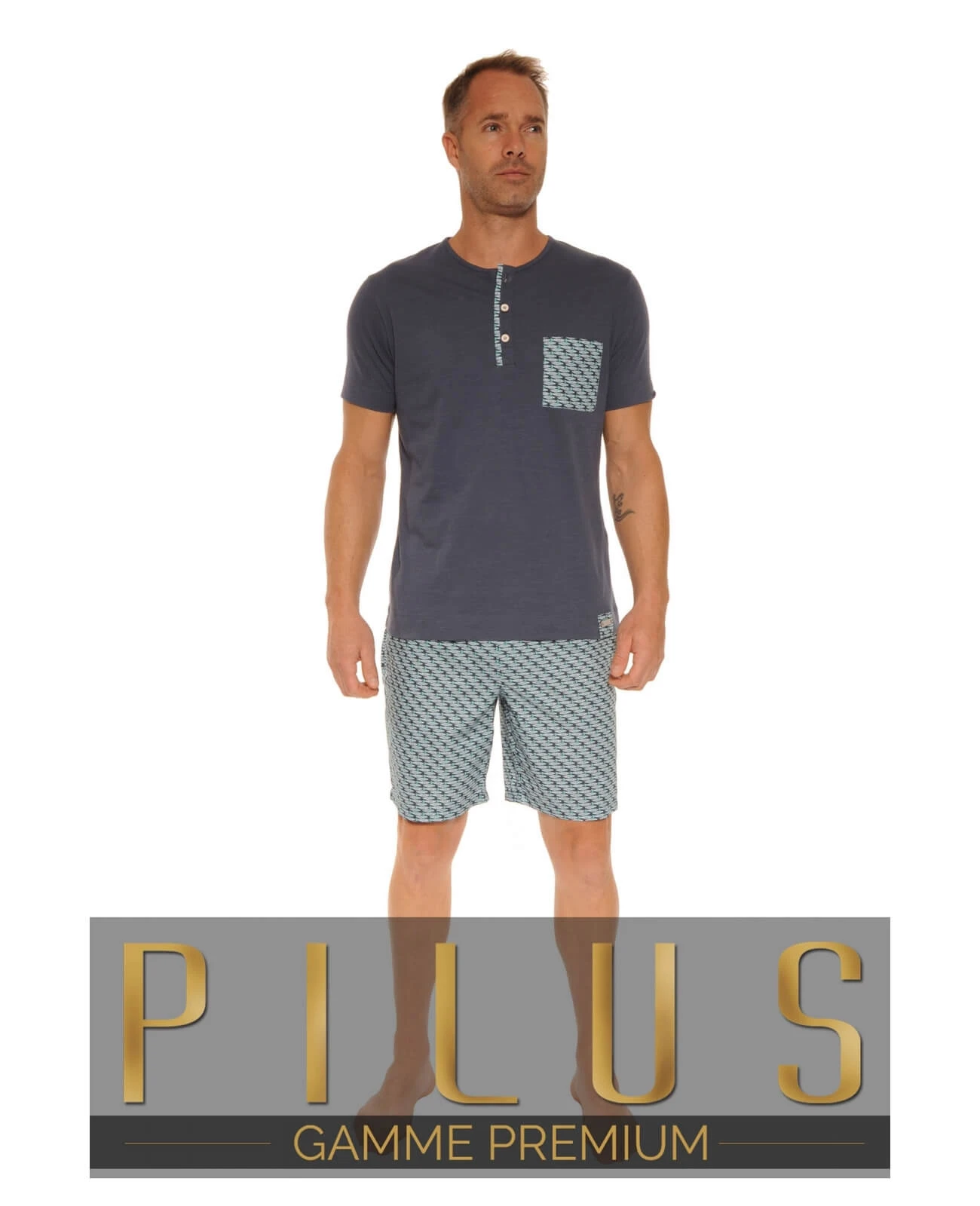 La marque PILUS est présente depuis plus de vingt ans sur les cinq continents dans les plus belles boutiques. Les belles matières, les finitions raffinées et les coupes impeccables, caractérisent cette gamme Premium. ! Pour des moments de détente et de repos réussis, nous avons imaginé pour vous un pyjama sobre et élégant. Tee shirt en jersey de coton doux et confortable, manches courtes, col rond ouverture par 3 boutons , uni bleu indigo et poche poitrine dans le tissu original du short. Short en tissu chaîne et trame 100% coton décliné dans un motif ludique, un banc de poissons aux teintes aqua, ceinture élastiquée avec lien de serrage, deux poches latérales.