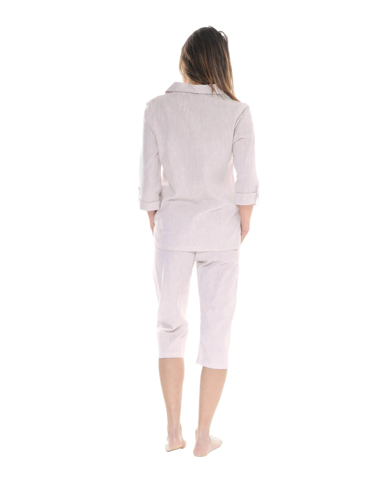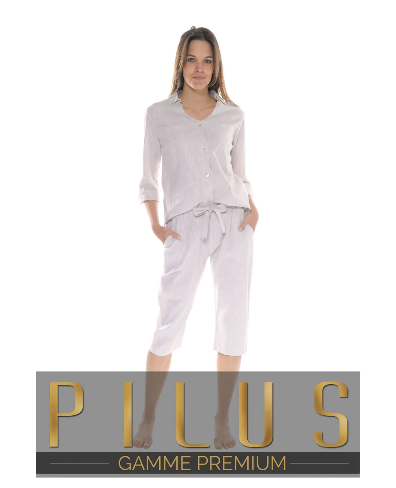 La marque PILUS est présente depuis plus de vingt ans sur les cinq continents dans les plus belles boutiques. Les belles matières, les finitions raffinées et les coupes impeccables, caractérisent cette gamme Premium. ! Un retour au naturel avec cet ensemble en lin coton, mélange d authenticité et de raffinement pour une style chic et sobre. Haut forme chemisier boutonné coloris taupe, encolure polo se terminant par un V, deux poches poitrines, manches aux coudes avec revers, deux fentes de côté. Le pantacourt coordonné de 70 cm est lui aussi en popeline lin coton, sa taille est élastiquée et sublimée par une ceinture à nouer sous passants. Détail indispensable, les deux poches cavalières.