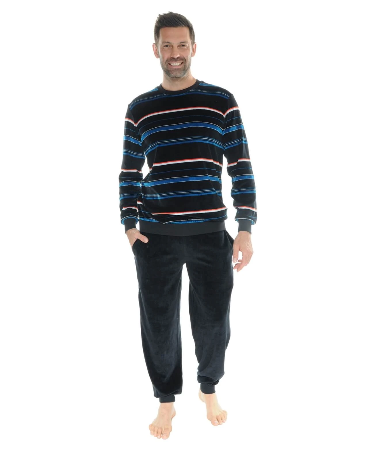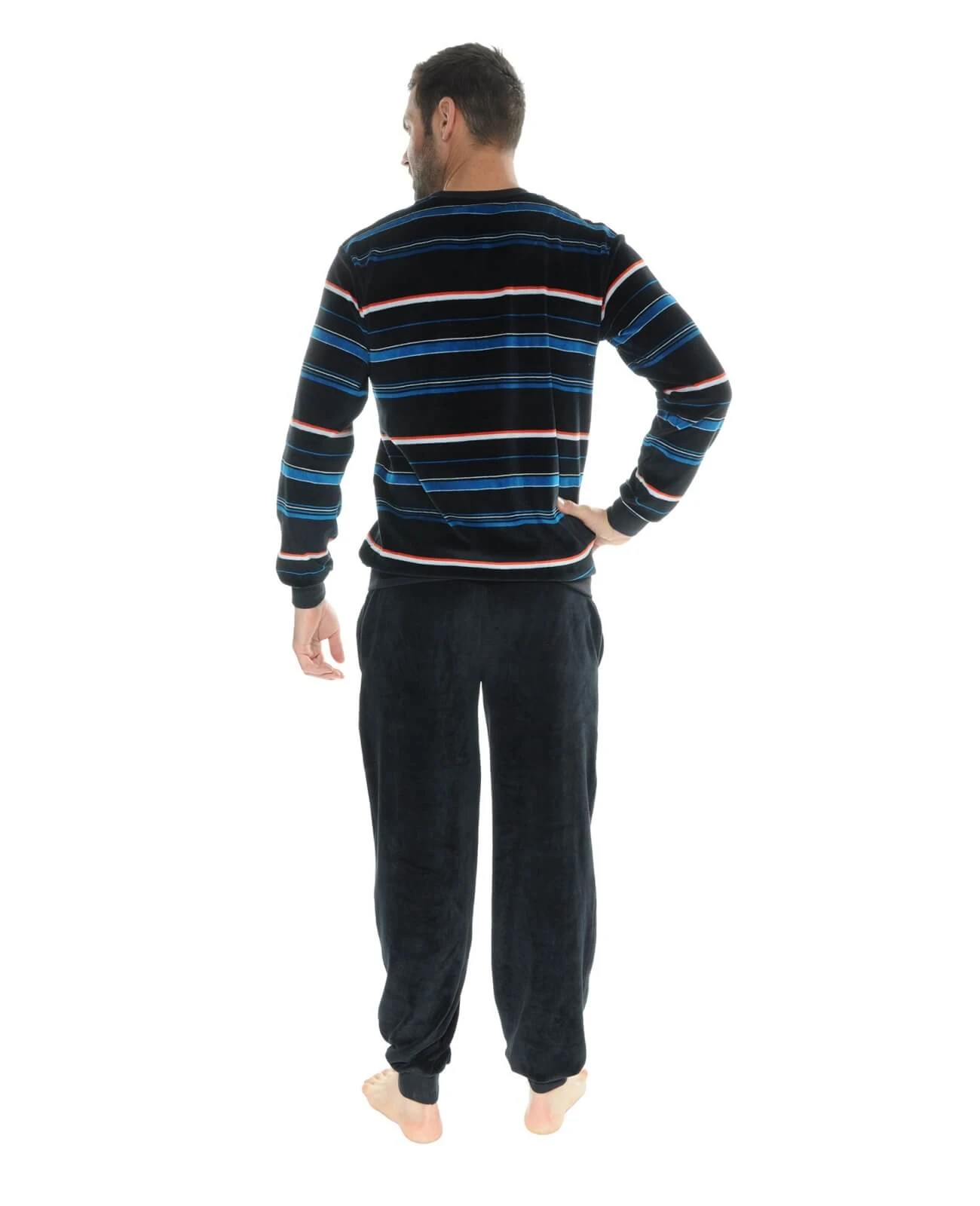 Classique et indĂ©modable, le velours est une promesse de confort et chaleur. Pyjama d intĂ©rieur forme jogging resserrĂ© par un bord cĂ´te aux poignets, sur le bas du t-shirt mais aussi sur le bas du pantalon pour un style dĂ©contractĂ© Ă la maison. Sweat encolure ronde, rayĂ© turquoise, orange et blanc sur fond noir, des coloris lumineux et joyeux. Pantalon jogging noir uni, taille Ă©lastiquĂ©e avec lien de serrage et 2 poches de cĂ´tĂ©. Cette tenue s’adaptera Ă toutes vos envies pour bouger sans retenue. Composition : 80% Coton 20% Polyester Cet article est confortablement coupĂ© ! Ne prenez donc pas une taille au dessus. Le mannequin mesure 1m80 et porte une taille 3 – Livraison rapide en 48 hrs et toujours les retours gratuits (France mĂ©tropolitaine)