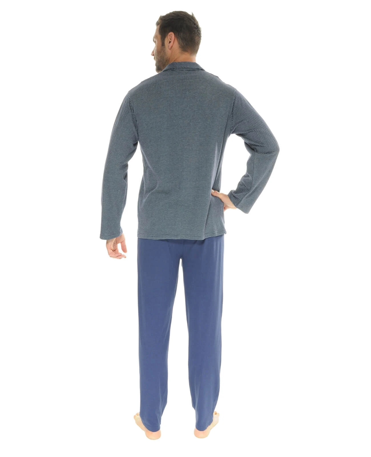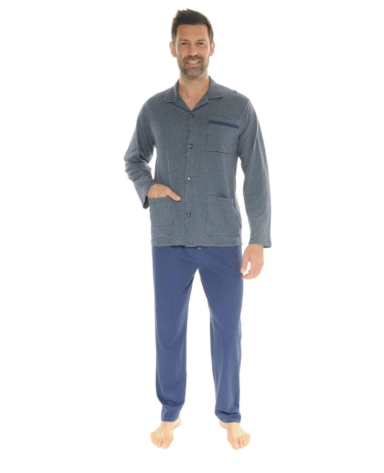 Pyjama forme tailleur en maille caviar 100% coton, un best de notre collection hiver. Une forme veste boutonnée appréciée des hommes à la recherche d un vêtement de nuit élégant et confortable. Veste col chemise fermée par 4 boutons et 1 bouton sous col , 2 poches plaquées sur le devant et une poche poitrine réhaussée dun galon marine. Pantalon coordonné uni marine en maille jersey de pur coton, à la ceinture élastiquée avec braguette 2 boutons. Confort et douceur garantis avec notre pyjama ILIODES. Cet article est confortablement coupé ! Ne prenez donc pas une taille au dessus. Le mannequin mesure 1m80 et porte une taille 3 – Livraison rapide en 48 hrs et toujours les retours gratuits (France métropolitaine)