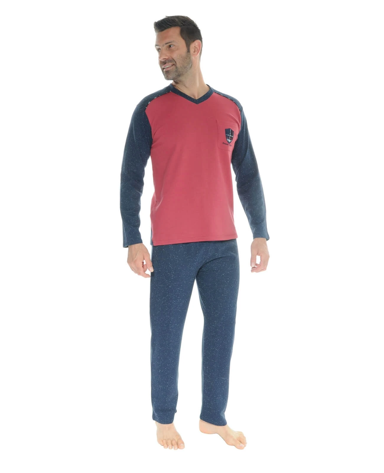 Dès les premières fraîcheurs automnales, plongez dans la douceur du molleton avec notre pyjama en maille molleton, chic et moderne. T-shirt col V bordeaux, manches longues unies bleu chiné avec coudières à carreaux et pantalon coordonné uni bleu chiné dans un molleton souple et léger pour un confort absolu et un look moderne et décontracté. Pantalon taille élastiquée avec cordon de serrage pour un parfait maintien. L’association du coton au polyester, procure souplesse, résistance et douceur pour un confort optimal et une liberté de mouvement sans égale. Cet article est confortablement coupé ! Ne prenez donc pas une taille au dessus. Le mannequin mesure 1m80 et porte une taille 3 – Livraison rapide en 48 hrs et toujours les retours gratuits (France métropolitaine)