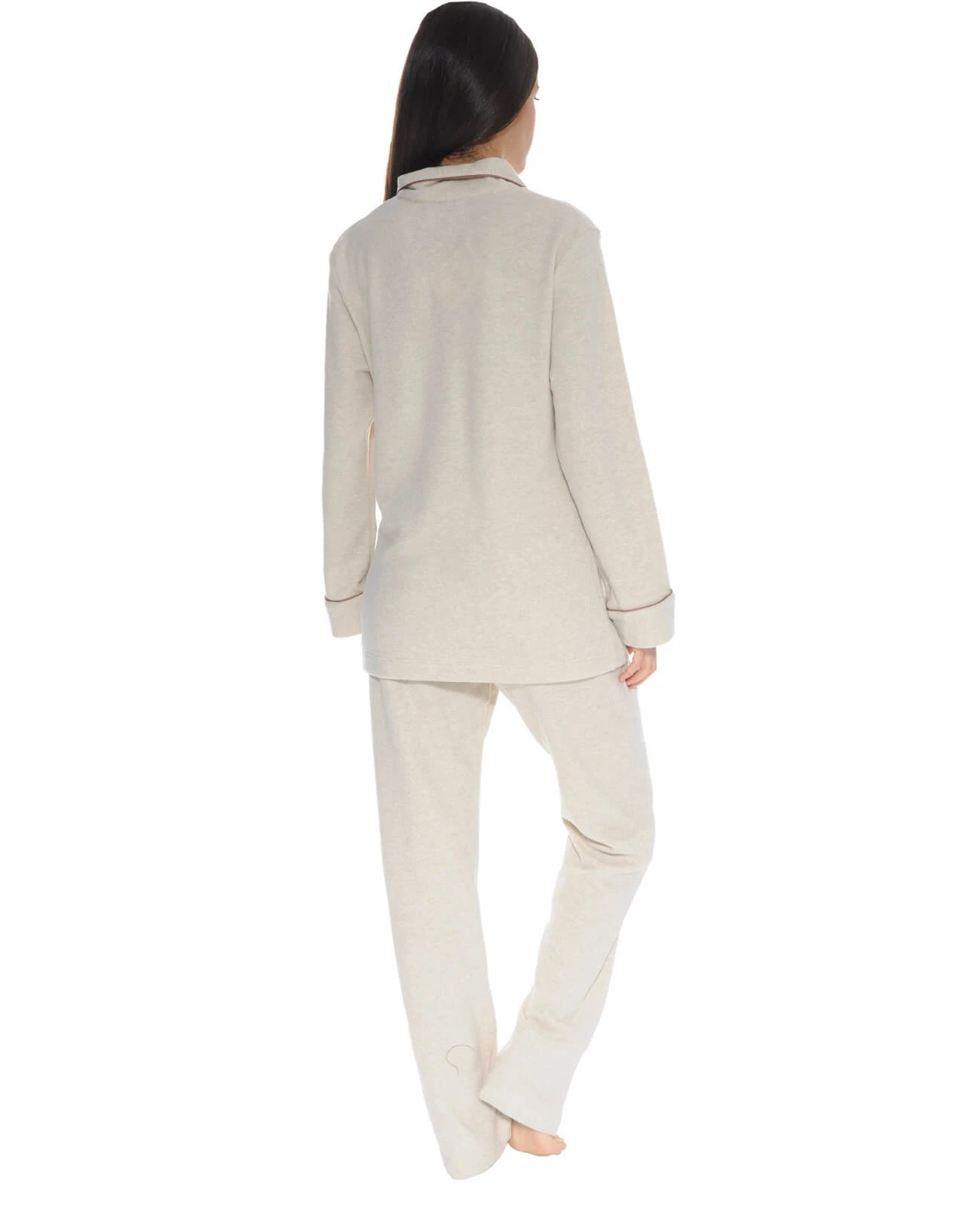 La marque PILUS est présente depuis plus de vingt ans sur les cinq continents dans les plus belles boutiques. Les belles matières, les finitions raffinées et les coupes impeccables, caractérisent cette gamme Premium. ! Vous recherchez une tenue confortable et stylée. Notre pyjama KATE en jersey molleton, une matière douce et chaude vous séduira et vous accompagnera pour tous vos moments cocooning . Une forme classique et chic appréciée des femmes élégantes. Haut forme chemisier entièrement boutonné, élégant avec ses boutons nacre gravés de la marque PILUS, son passepoil en satin contrasté au col , sur la bande de boutonnage, aux poignets et sur le haut de la poche poitrine. Un style épuré et sans artifices dans un ton de beige naturel. Pantalon coordonné, douillet et confortable avec sa taille élastiquée. Jersey molleton : 62%coton 38%polyester