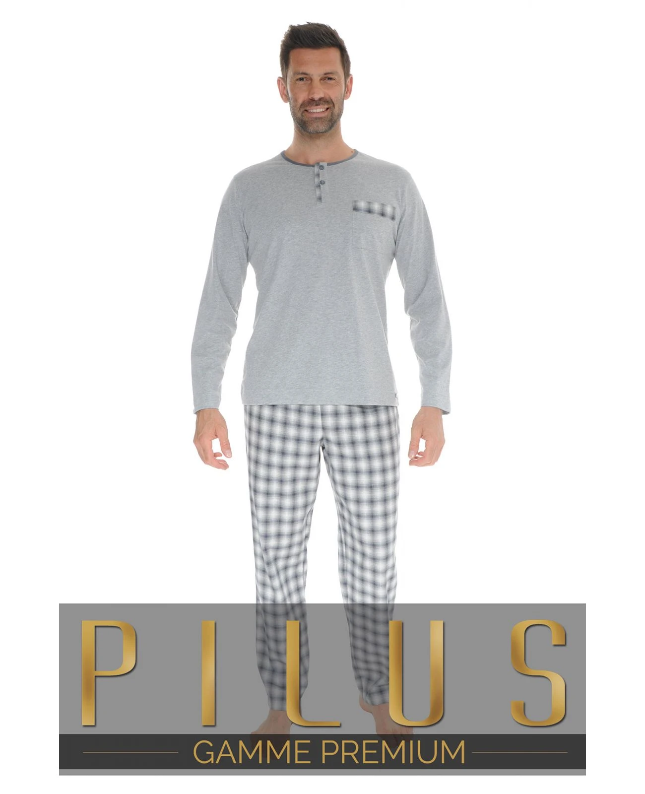 La marque PILUS est prĂ©sente depuis plus de vingt ans sur les cinq continents dans les plus belles boutiques. Les belles matières, les finitions raffinĂ©es et les coupes impeccables, caractĂ©risent cette gamme Premium. ! LEDONIS, un pyjama sobre et Ă©lĂ©gant avec son tee shirt en maille jersey de pur coton dĂ©clinĂ© dans un coloris gris clair intemporel. Col rond ouverture par deux boutons pour faciliter le passage de la tĂŞte et poche poitrine ton sur ton. Mais vous serez sĂ©duit par les dĂ©licates finitions : le rappel du tissu Ă carreaux du pantalon que l on retrouve le long de la patte du boutonnage et sur le haut de la poche poitrine. Le style est dans les dĂ©tails pour un pyjama d exception. Pantalon Ă carreaux gris clair, confortable en popeline de coton, agrĂ©able Ă porter avec son Ă©lastique de maintien Ă la taille agrĂ©mentĂ© d’un lien de serrage.