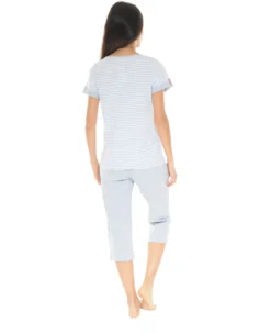 Le pantalon et Ă©galement ornĂ© de l’imprimĂ© Ă rayures pour ĂŞtre coordonnĂ© avec le haut. Il possède deux grandes poches, elles aussi bordĂ©es de dentelle, et d’une taille Ă©lastiquĂ©e.