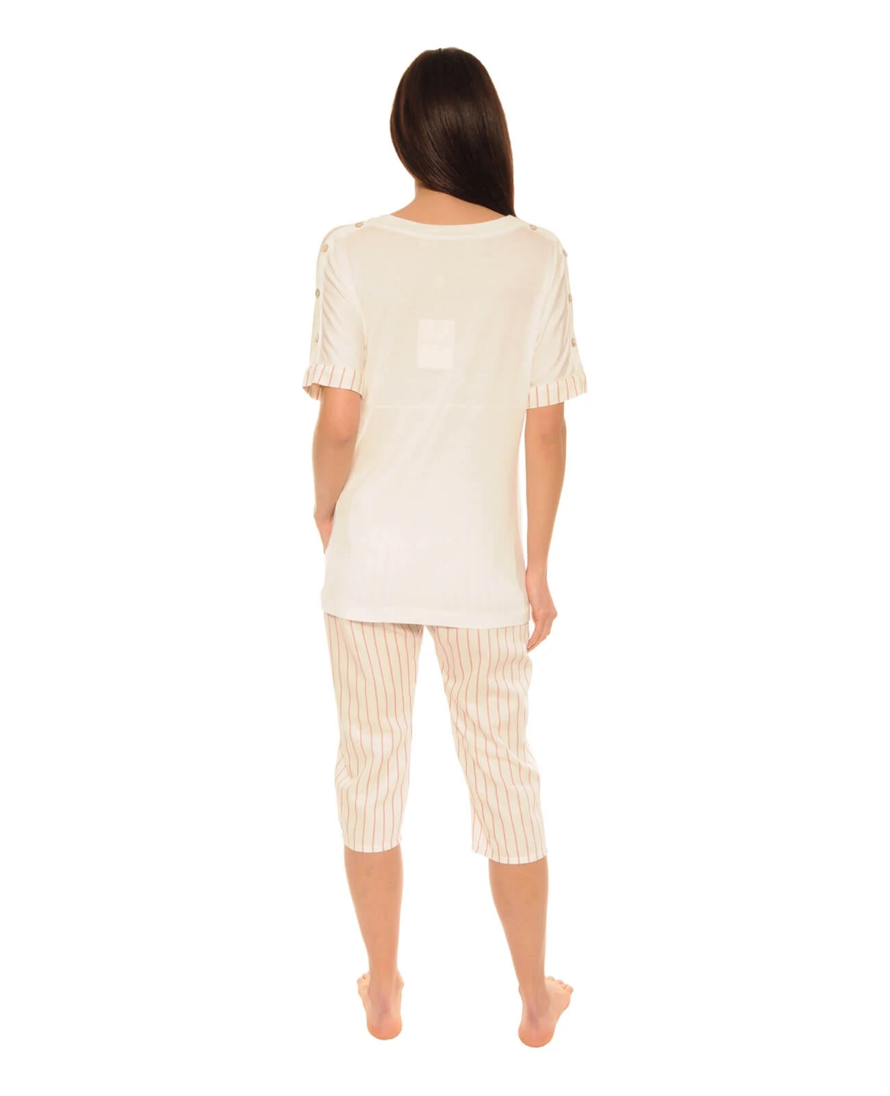 La marque PILUS est présente depuis plus de vingt ans sur les cinq continents dans les plus belles boutiques. Les belles matières, les finitions raffinées et les coupes impeccables, caractérisent cette gamme Premium. ! Entre tradition et modernité, PILUS propose des vêtements dintérieur pour vivre lintimité à la maison comme un instant précieux. Un choix de matières nobles pour flâner avec élégance. Haut écru en jersey de coton modal souple et délicat, manches courtes tombantes bordées de boutons fantaisies, col V, une poche poitrine. Corsaire de 65cm en popeline viscose coton, une fine rayure abricot sur un ton nacre pour un style chic et élégant. Deux poches cavalières, taille élastiquée avec lien de serrage.