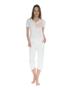 Une ambiance printanière, un harmonieux mélange de maille jersey dévorée à la douceur d’une fleur de coton dans des tons pastels, pour un ensemble pyjama chic et confortable, pour vous Mesdames. Lensemble est composé dun tee shirt manches courtes, en polycoton, une maille jersey de pois dévorés sans aucune transparence, encolure en forme arabesque et d’un corsaire de 76cm 100% Coton uni écru. La ceinture du corsaire est élastiquée pour vous apporter suffisamment de maintien sans serrer, vous apprécierez les deux poches cavalières et les boutons colorés sur le bas. Le jersey pur coton utilise des fils peignés de grande qualité afin dassurer la meilleure durabilité dans le temps. La mannequin mesure 1m70 et porte une taille S – Livraison rapide en 48 hrs et toujours les retours gratuits (France métropolitaine)