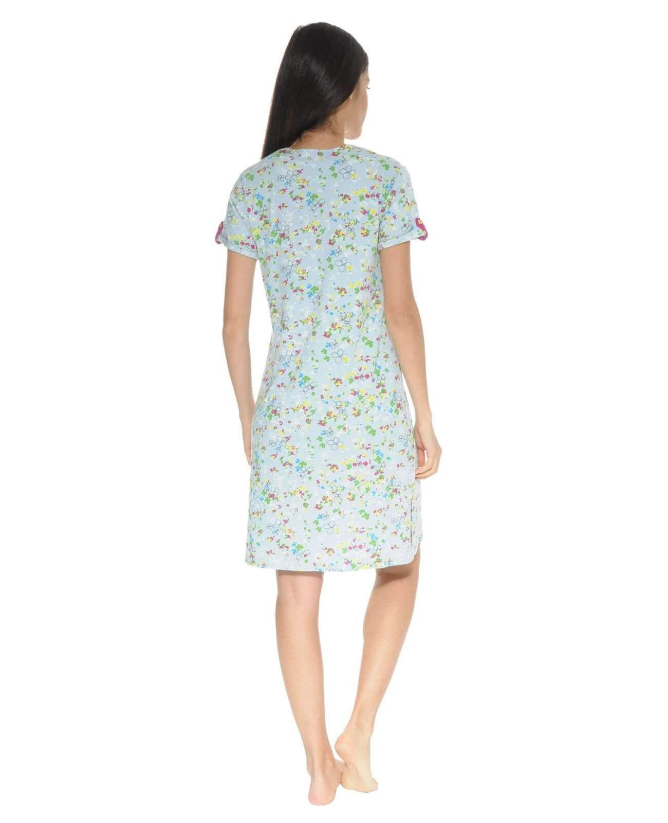 Chemise de nuit encolure ronde ouverture par 4 boutons fuchsia, manches courtes avec revers maintenu par une patte de boutonnage fuchsia.