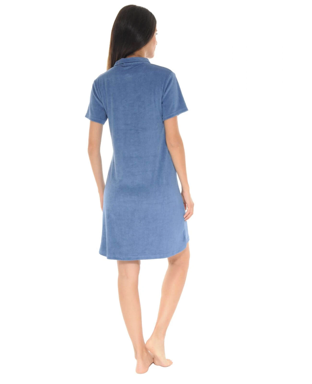 Cette robe est dotée d’un col tailleur avec une ouverture par 3 boutons blancs ainsi qu’une poche poitrine plaquée ton sur ton avec un discret liseré blanc sur le haut de la poche.