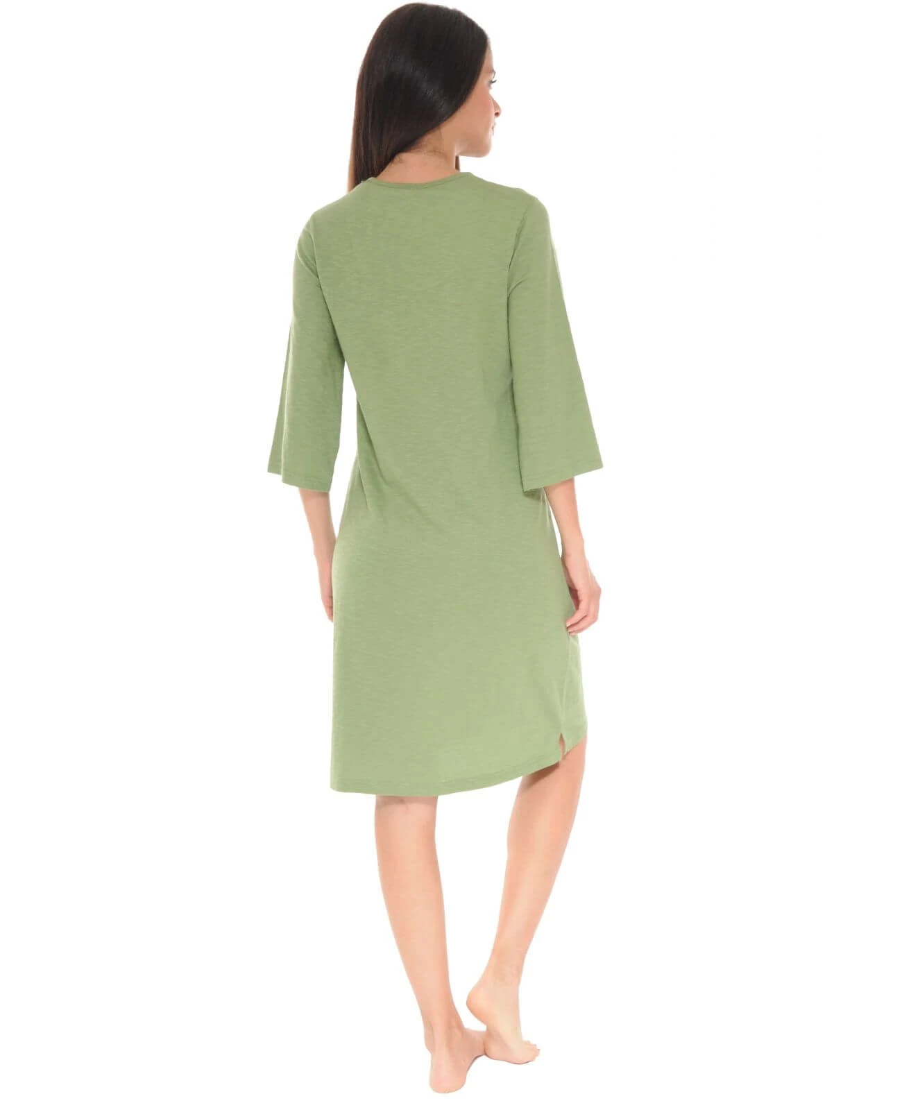 Cette robe est parée d’une couleur kaki toujours très appréciée, ainsi que d’un col rond avec possibilité d’ouverture par un bouton.