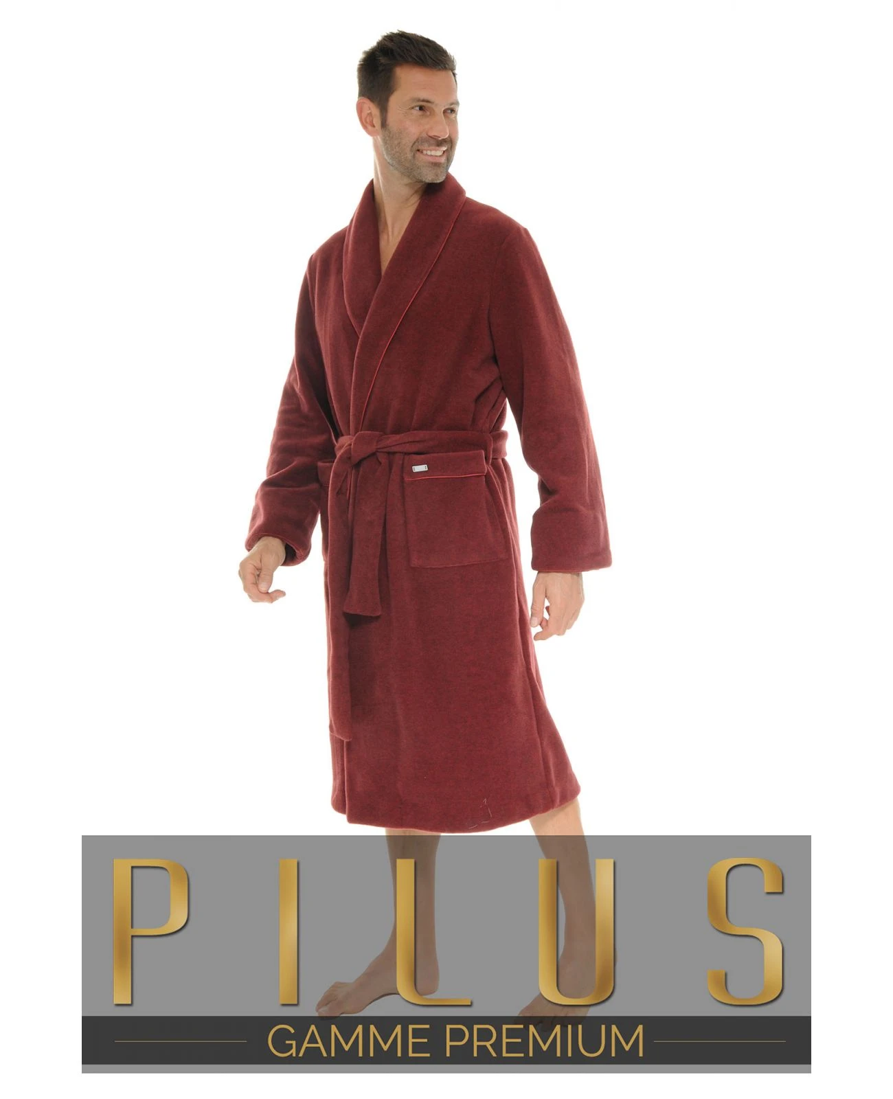 La marque PILUS est présente depuis plus de vingt ans sur les cinq continents dans les plus belles boutiques. Les belles matières, les finitions raffinées et les coupes impeccables, caractérisent cette gamme Premium. ! Soyez chic dès le lever avec cette robe de chambre col châle de qualité, en polaire 100% Polyester. Cette magnifique robe de chambre, sobre dans la coupe et réalisée avec raffinement vous apportera douceur et chaleur. Pièce indispensable de votre dressing avec son coloris Bordeaux Foncé intemporel.