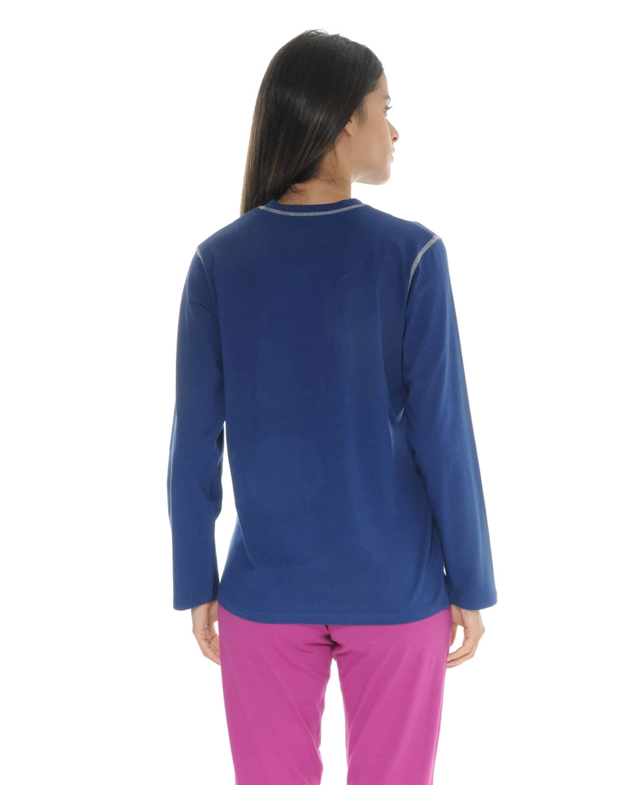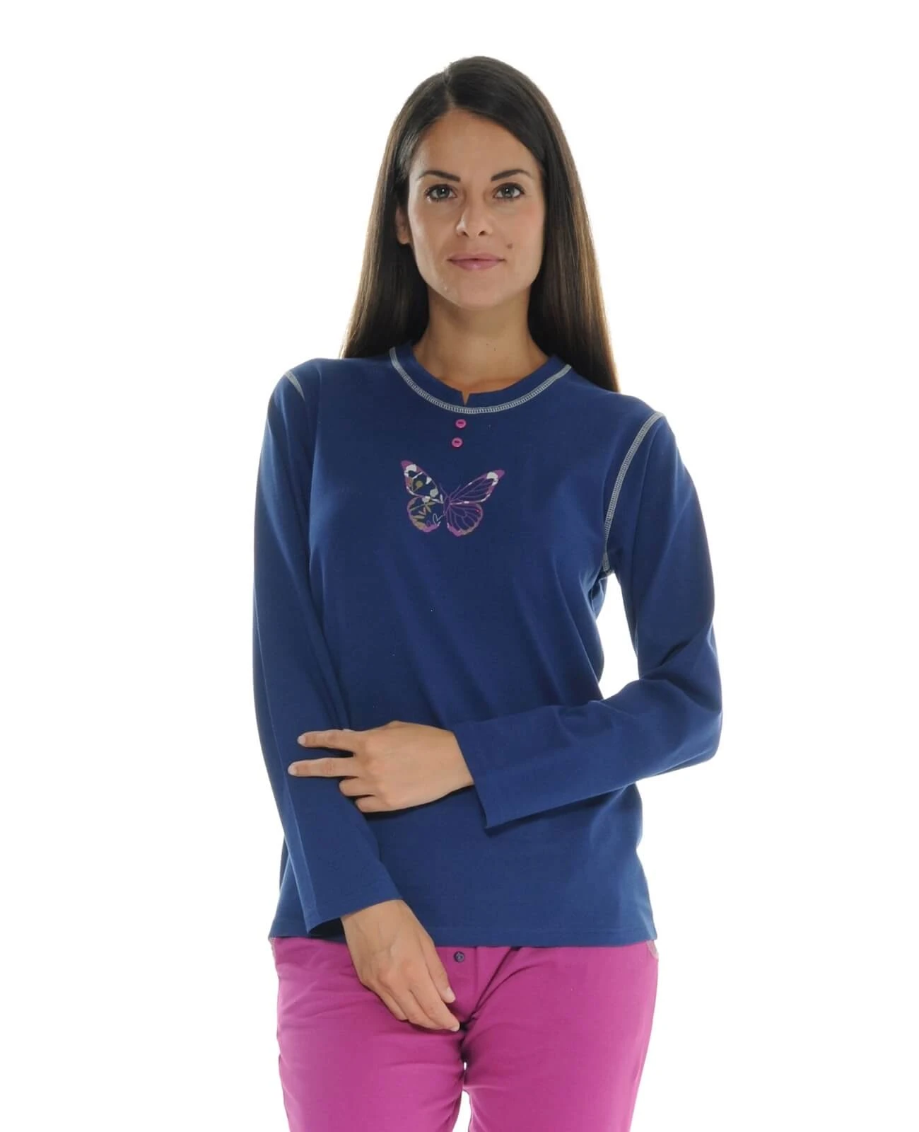 Le Mix and Match, c est l art de crĂ©er son propre style en composant soi-mĂŞme ses tenues de dĂ©tente. Osez crĂ©er votre dressing de nuit avec notre ligne JANICE composĂ©e de tee-shirts et pantalons Ă mixer sans modĂ©ration. Tee shirt encolure ronde, manches longues, en maille jersey, doux et confortable uni bleu cobalt. Un coloris chaud et lumineux, sublimĂ© par une sĂ©rigraphie de papillon fuchsia. Vous aimerez le dĂ©tail de ses finitions : les surpiqĂ»res blanches et les deux boutons fantaisies sous lencolure. La mannequin mesure 1m70 et porte une taille S – Livraison rapide en 48 hrs et toujours les retours gratuits (France mĂ©tropolitaine)